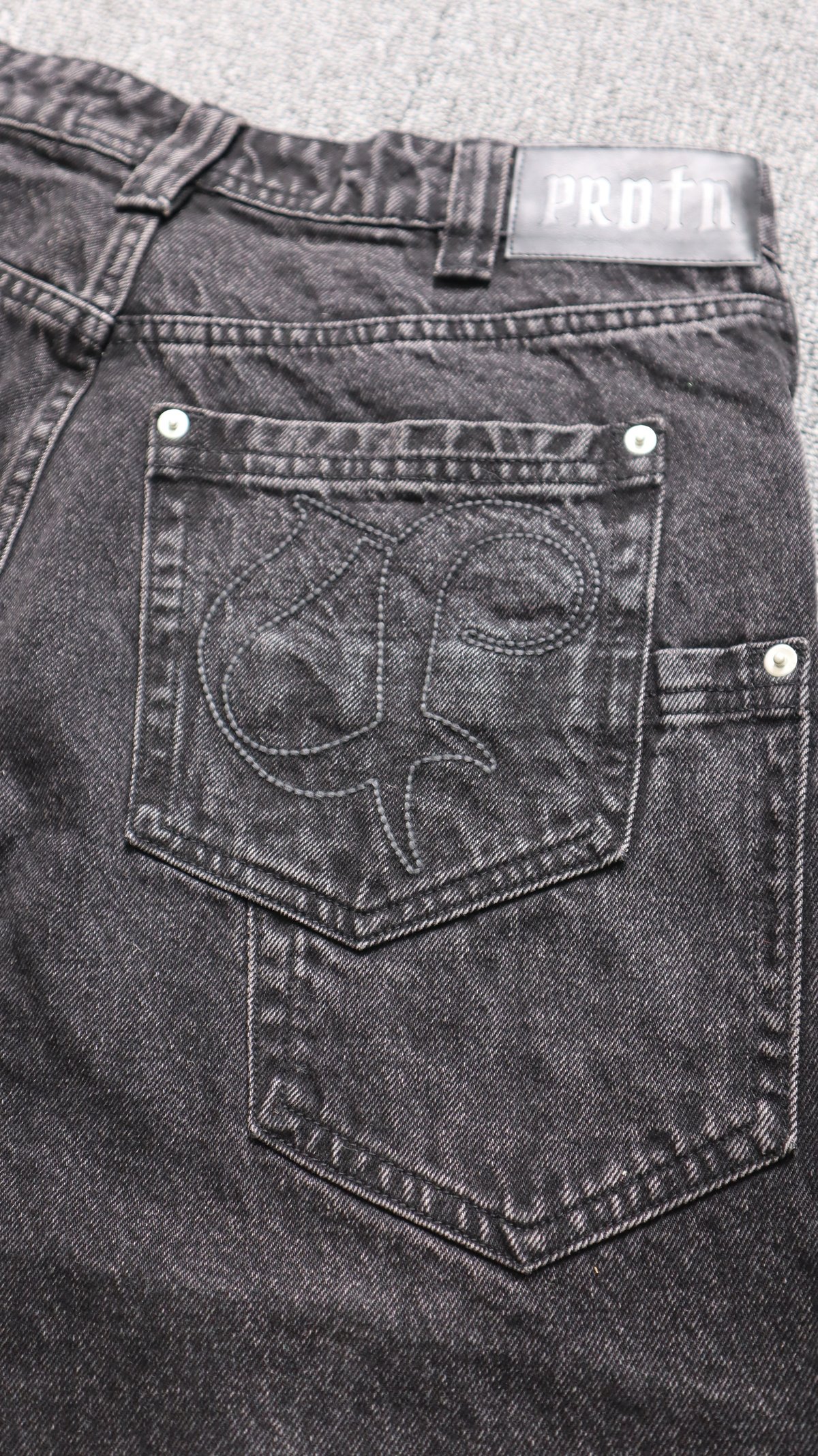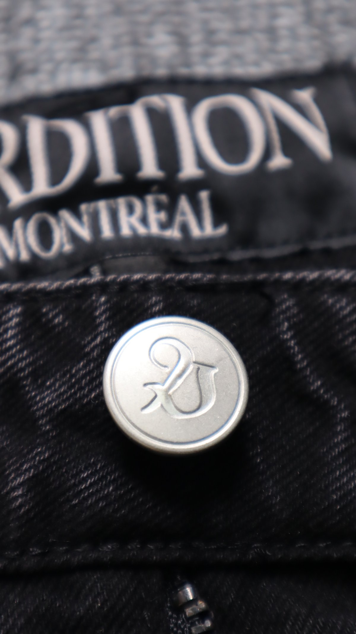 • 14 oz • 100% cotton denim fabric • High waist • Tapered legs • YKK zipper • Customized "P" YKK button •"P" reflective embroideries on the back pockets • Unique stitching details • "Perdition" customized rivets engraved • "PRDTN" waist tag